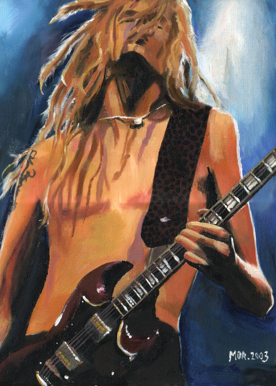 Linde, guitarist in the band HIM. Acrylic colours on canvas. And the thing wouldn't fit in my scanner, so that's why you see where I put the pieces together. What can I say? I didn't quite know how to use Photoshop at the time.