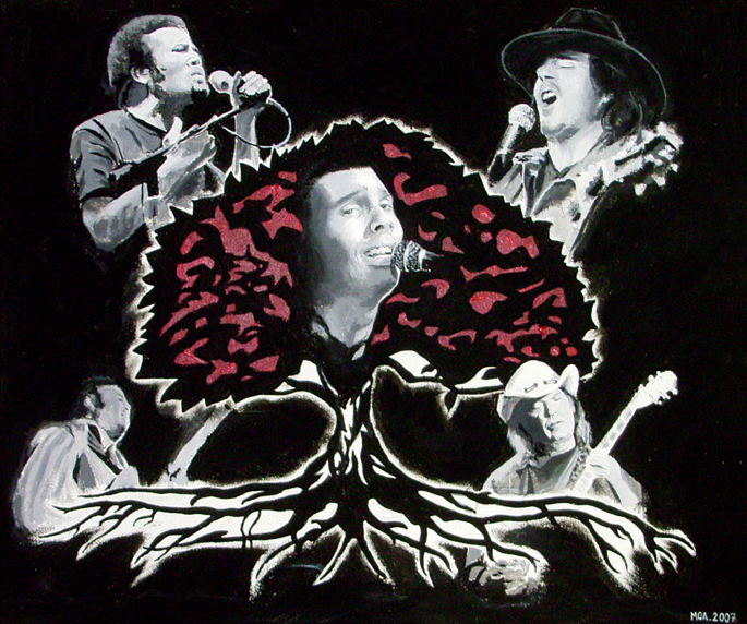 A painting I made for a friend of my mother's. Her son turned 30, and she wanted a painting of him and this tree, surrounded by his four idols. I just recognize one of them. Acrylics on canvas.