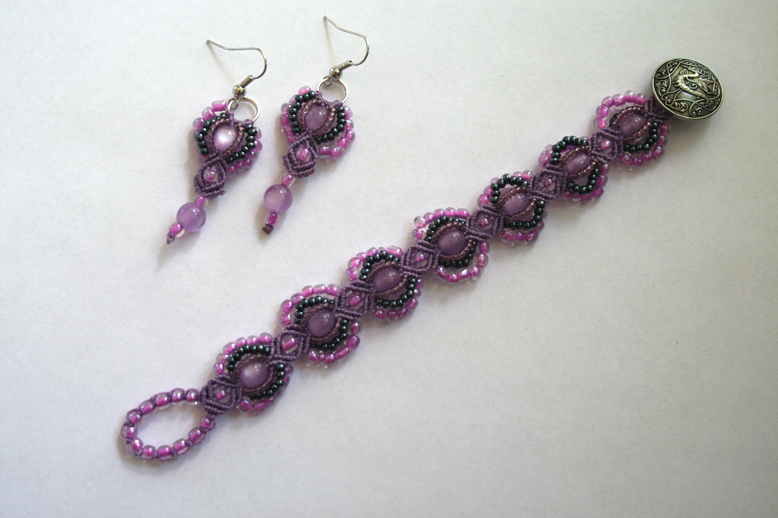 A micro macramé bracelet with matching earrings in lilac that I made for a friend.