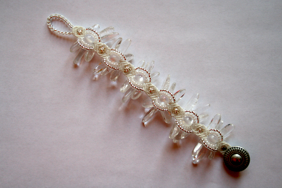 A micro macramé bracelet in white, framed by clear stones in different sizes, made for a friend's graduation.